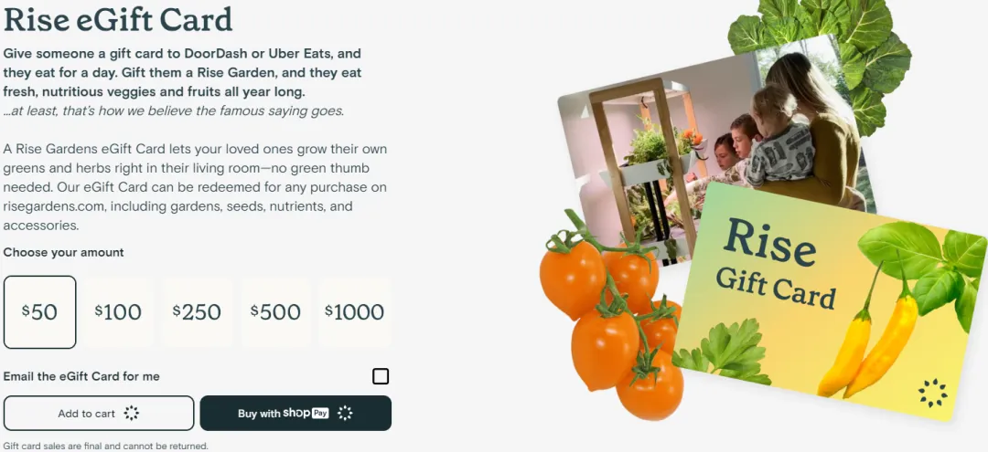 为了顺应这一趋势,Rise Gardens推出了电子礼品卡,用户可以选择50到1000美元不等的额度,并通过邮件发送给送礼人。这种设计极大地拓宽了品牌的消费场景,当消费者不确定对方是否喜欢某款具体产品时,礼品卡提供了一种低风险的选择方式,减少了送礼决策的复杂性。同时,礼品卡的推出也能帮助品牌吸引新的潜在用户,进而提高整体销售转化。