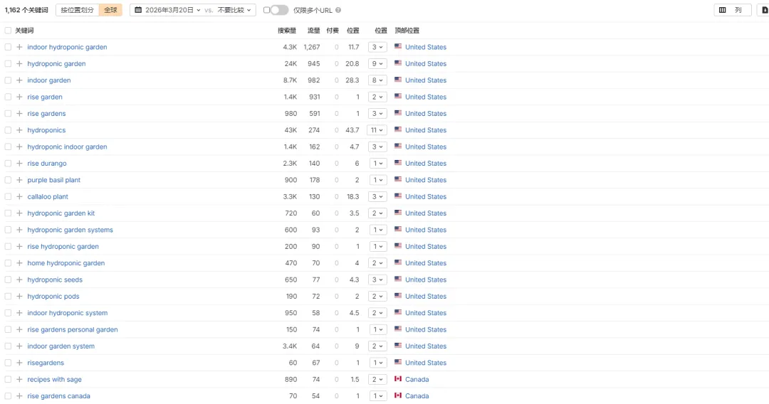这表明,Rise Gardens的SEO策略并非单纯追求流量覆盖,而是优先占据高商业意图的关键词,以便能够直接接触到那些已具备购买需求的潜在用户。此外,Rise Gardens的品牌词大多稳定在搜索结果前列,这意味着品牌搜索已初具规模。