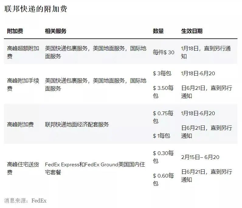 包括额外操作费,高峰附加费和住宅交付费的增加,涉及的渠道包括FedEx Express、Ground、International Ground以及Express Package Services。