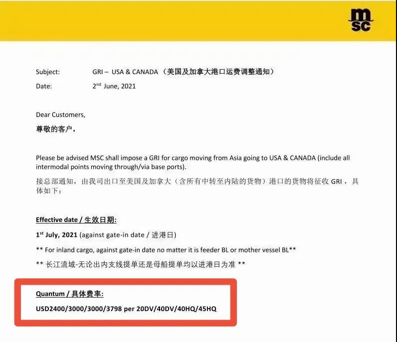 MSC则将在7月1日起对所有出口到美国、加拿大的航线加价。