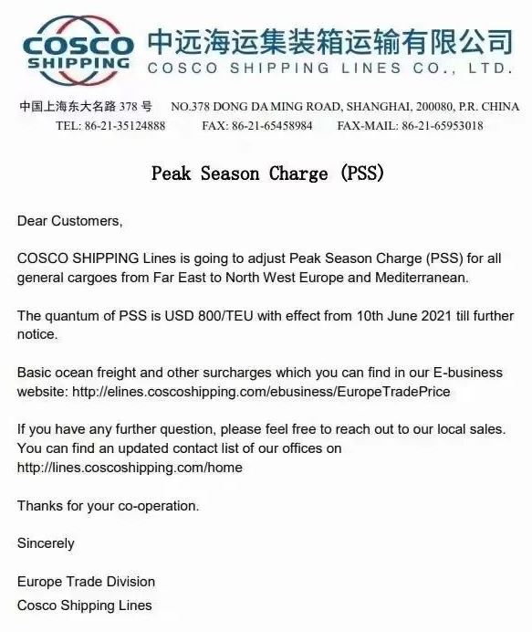 5月28日再度向客户发出通知,7月1日起将扩大加收综合费率上涨附加费(GRI),每40尺柜加收2000美元、每20尺柜加收1800美元;6月15日则是最新调涨。