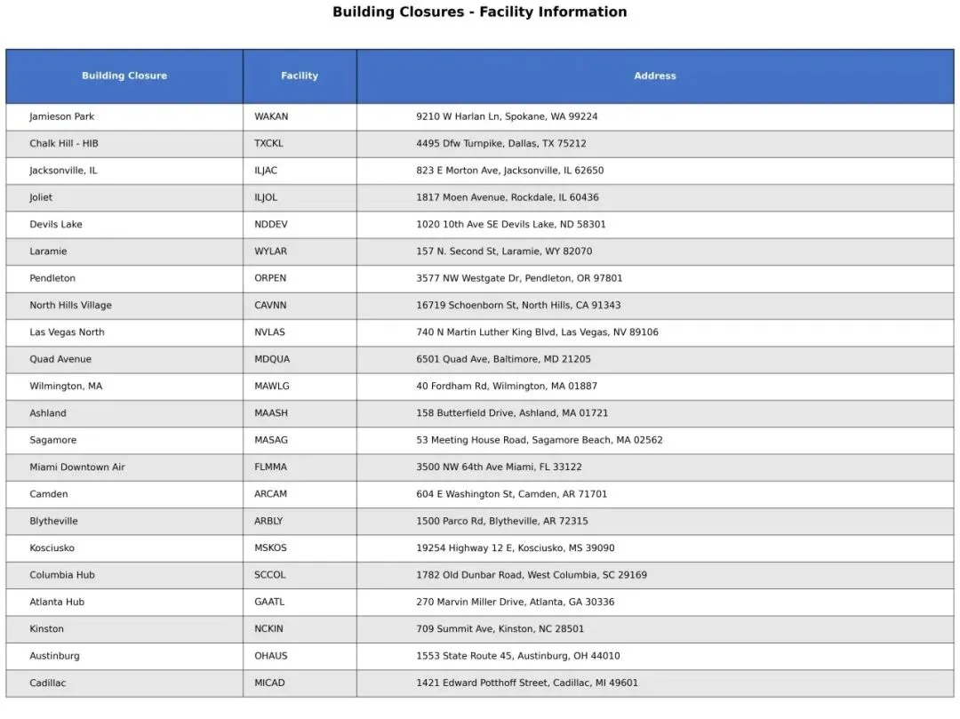 与此同时,FedEx也在推进更为大规模的网络重组。根据公司披露,在“Network 2.0”整合计划下,FedEx预计将在2027年底前关闭超过475个站点,约占现有设施规模的30%。目前已关闭200多个站点,未来两年将继续推进整合,重点已从小型市场转向包括旧金山在内的大型都市区。