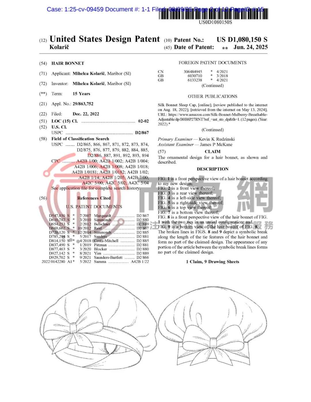 【侵权快讯】25-cv-9459 国人案件+1!这款HAIR BONNET 发帽刚下证不到两月就开始发案维权!