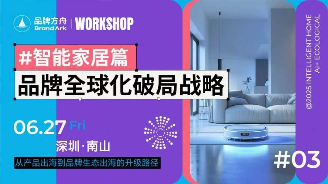 为了帮助智能家居品牌在全球市场中实现突破,品牌方舟将于6月27日在深圳南山举办“方舟品类workshop-智能家具篇品牌全球化破局战略私享会”,此次会议将聚焦于“从产品出海到品牌生态出海的升级路径”,讨论中国智能家居企业如何在全球市场中实现品牌升级和生态化发展。(活动为审核制,审核通过将发放活动邀请函)