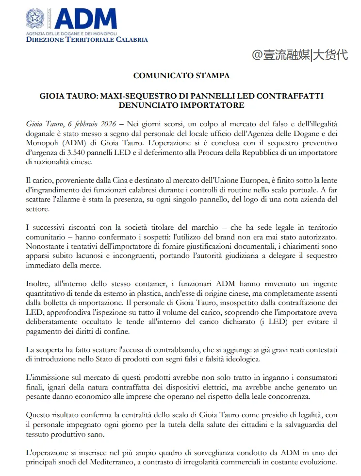 根据意大利海关和垄断局(ADM)在当地时间2月6号发布的通报消息显示,ADM官员在意大利南部的焦亚陶罗港查获了一批来自中国的LED面板及其他瞒报货物。