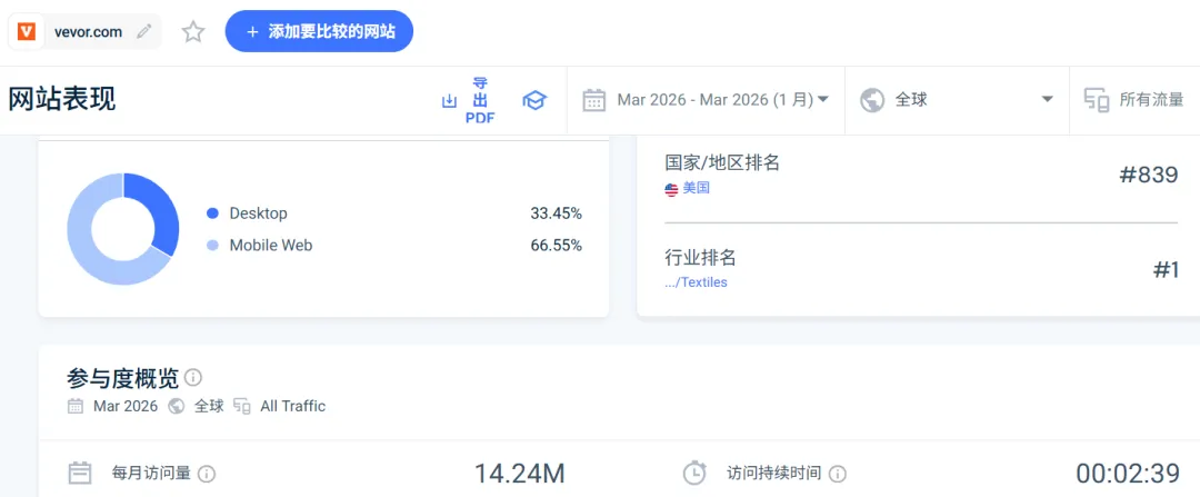 据SimilarWeb数据,VEVOR的独立站最近一个月的月访问量超过了1400万,在全美排名第839,在全球纺织行业中排名第一。