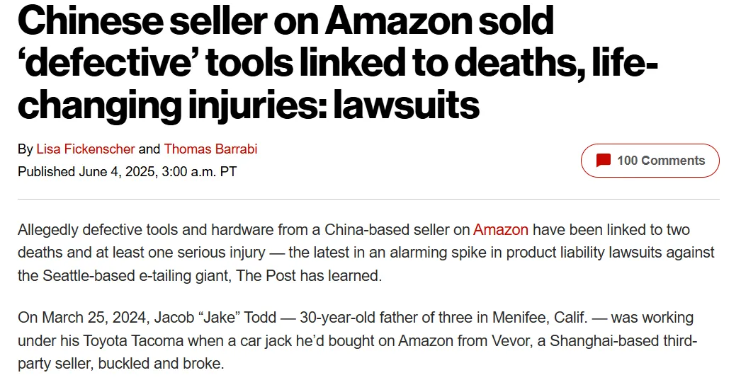 此外,去年6月,该媒体还曝出Vevor公司因其在亚马逊上销售的产品而面临召回,以及多起过失致人死亡和人身伤害诉讼。