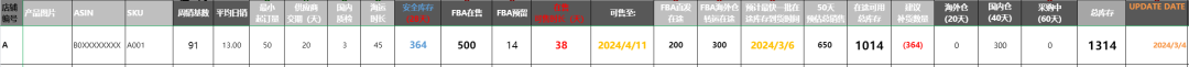 SKUA001近一周的销量是91个,平均一天是13个 它的最小起订量是50个,所以如果加采的话至少50个起 交期是20天,国内质检是3天,海运到货是45天,所以如果今天下单,大概68天后入FBA仓 根据近一周的销量来看,28天的安全库存应该是364个,而目前实际FBA在售库存500个,预留14个,库存很安全,预计可售至4月11号 但这个SKU的在途库存还有500个,最近一批预计3月6号到货,估计是最近销量下降了 目前可售库存和在途库存一共是1014,根据近一周的销量情况,两个月都卖不完,国内还有300个库存,总可用库存是1314个。完全不需要考虑是否需要补货,而是要考虑它会不会要滞销,可以先准备一些销量加速措施,把销量提升到之前的正常速度 最后是库存监控的时间,2024年3月4日