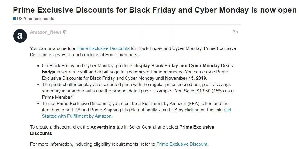 也就是说,你可以在 2019 年 11 月 15 日前为黑色星期五和网购星期一创建 Prime 专享折扣,然后在黑色星期五和网购星期一,商品会在搜索结果和详情页面中向获得认可的 Prime 会员显示黑色星期五和网购星期一促销标记。