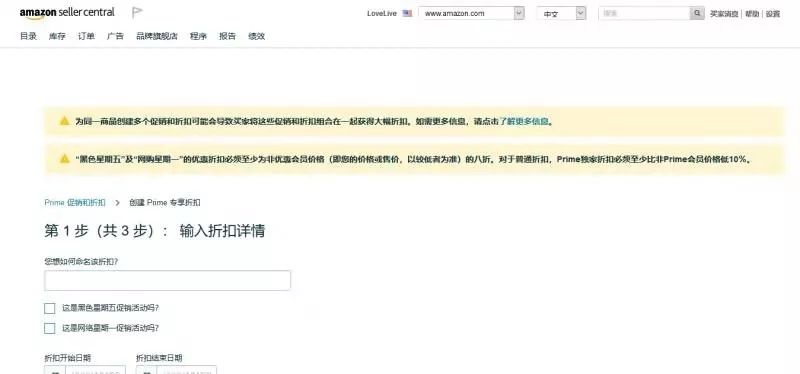 点击 【Prime 专享折扣】页面上的【创建折扣】,输入折扣名称和日期,然后上传填写好的促销上传电子表格