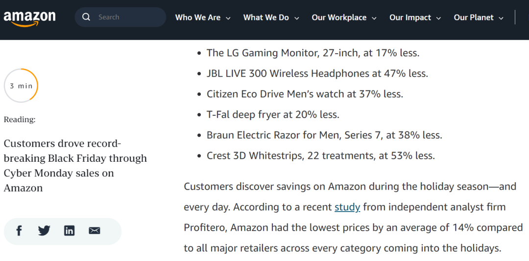 于是侃哥到亚马逊官网去查阅了一番,还算有所收获。亚马逊首先强调平台提供了难以置信的优惠,并列举了具有代表性的产品。官方还引用了Profitero的研究数据:进入旺季后,与每个类别的所有主要零售商相比,亚马逊的均价低14%。最热销的商品有:玩具、亚马逊设备、3C、家居、美容等品类。