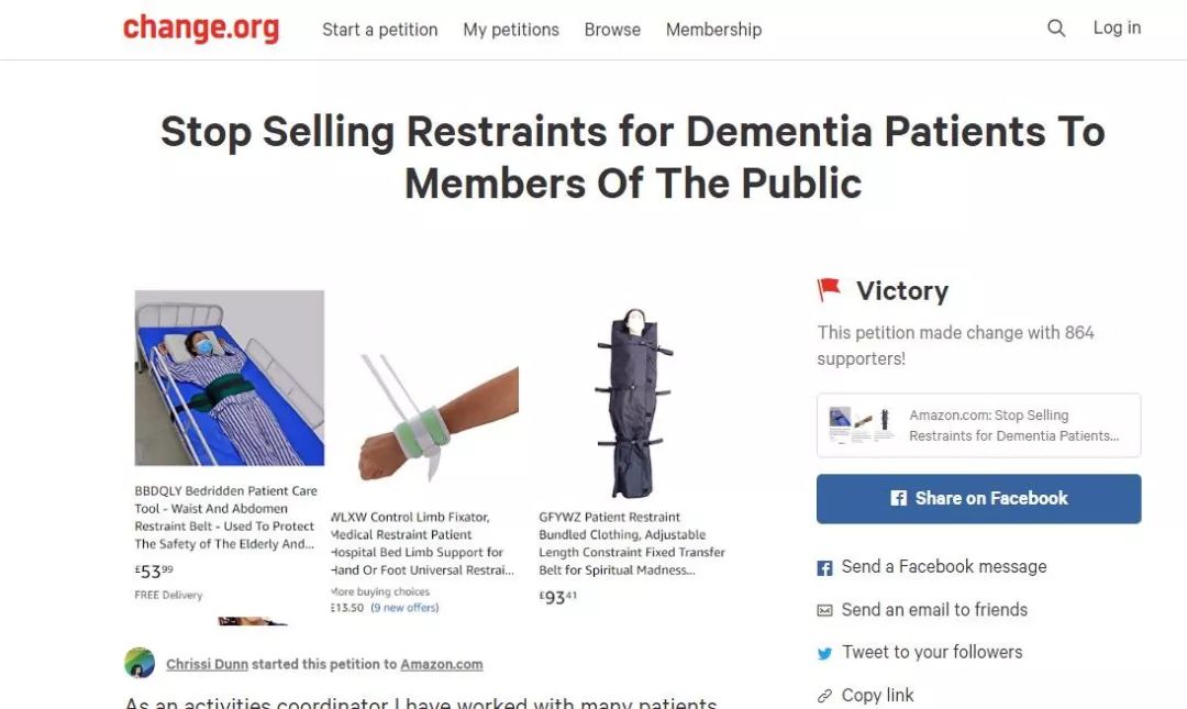 在请愿书和慈善机构的谴责之后,一件“紧身衣”现已被亚马逊撤下,并承诺停止向痴呆症患者销售“紧身衣”。
