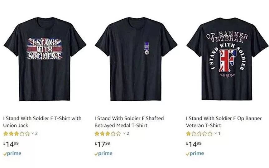亚马逊正被要求移除一系列以Soldier F为主题的T恤,这些T恤从今年4月起就可以在网上买到。它们指的是Soldier F,他曾是一名伞兵,1971年在德里的血腥星期日(Bloody Sunday)杀害两名男子,目前正面临起诉。