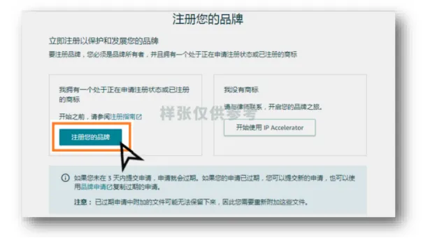 账户创建后会自动进入品牌注册后台,只要你有正在申请中的商标(TM标)或已注册成功的商标(R标),就能点击“注册您的品牌”开始申请。