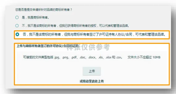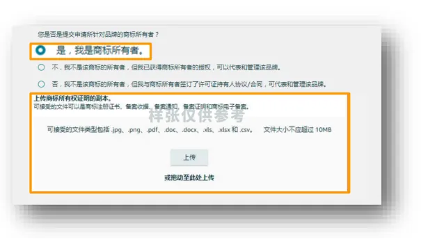 填写完商标信息后,系统会询问“你是否是该品牌的商标所有者”,根据实际情况选择,并上传对应文件,三种情况对应要求如下: