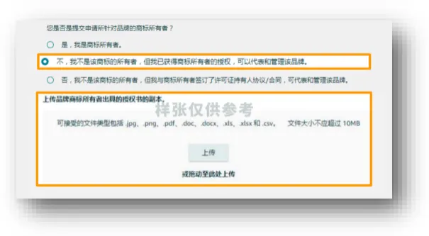 2.非所有者,但获授权管理品牌:上传商标所有者出具的正式授权书。