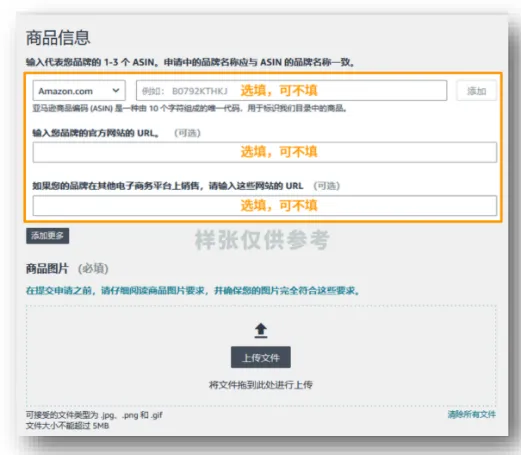 1.填写1-3个代表品牌的ASIN,注意ASIN中的品牌名必须与申请的品牌名完全一致;