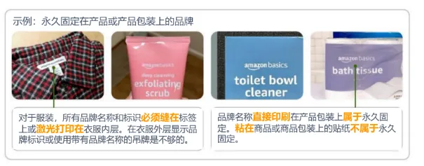 2. 品牌标识需为永久性标识(印刷、缝制、激光蚀刻等,贴纸、吊牌不算),清晰展示在商品或包装上;