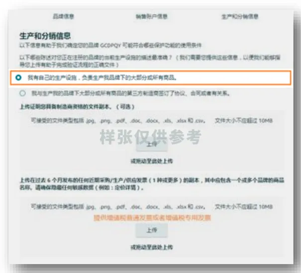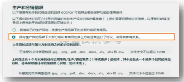 2. 第三方代工生产:需上传与第三方制造商的合作协议(如采购合同),以及过去6个月的采购发票(必填,隐藏敏感信息)。