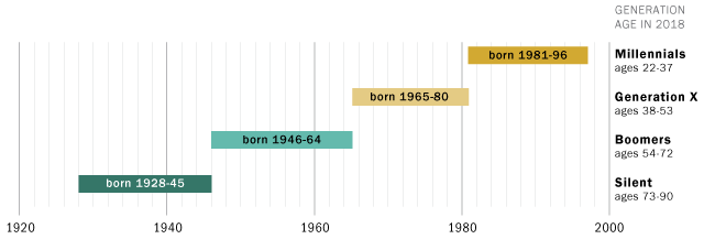 **沉默的一代(出生于1928年至1945年,73-90岁);婴儿潮一代(出生于1946年至1964年,54-72岁);X世代(出生于1965年至1980年,38-53岁);千禧一代(出生于1981年至1996年,22-37岁)。