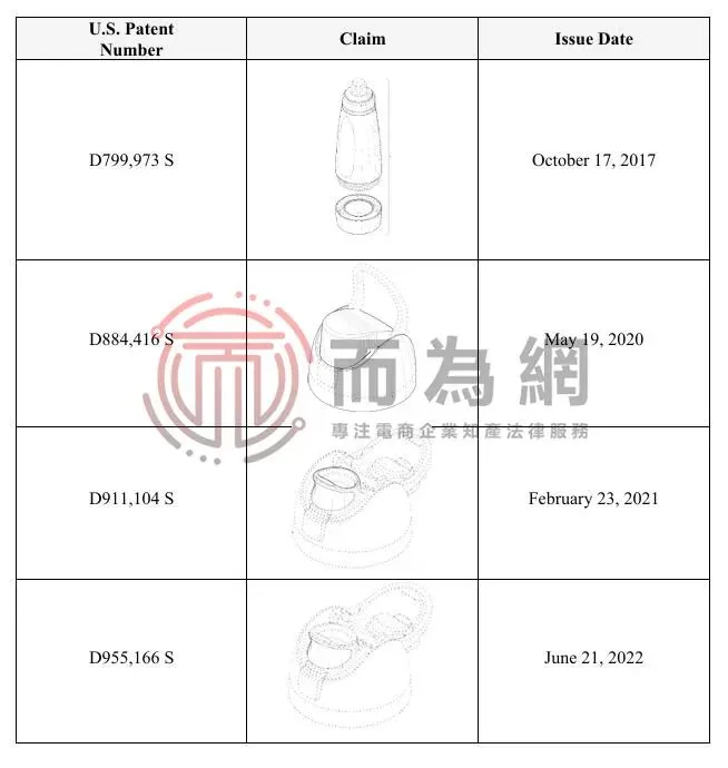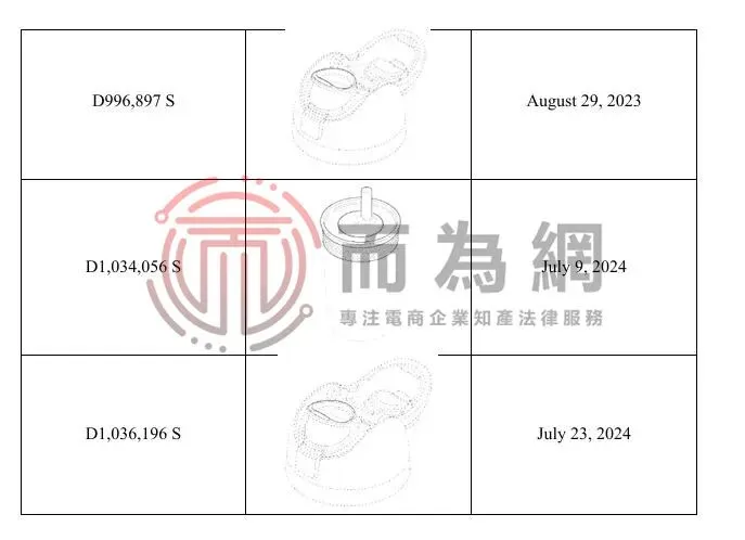 本案涉及7项外观专利,从壶嘴到瓶身。未经授权以下专利同款水杯都要谨慎上架,避免侵权!