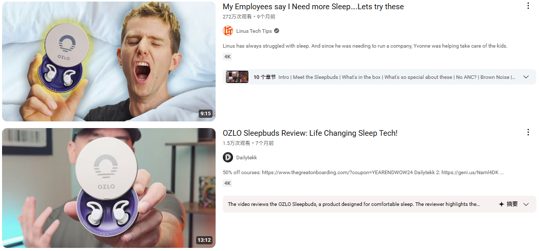 除此之外,Ozlo与@nosleeplessnights(睡眠领域博主)、@LinusTechTips(消费科技博主)、@Dailytekk(科技博主)等知名KOL合作,发布解读Sleepbuds产品性能、测评噪音模式下睡眠效果、真实佩戴体验感等用户关注内容,垂直种草至精准用户,扩大品牌受众群体,实现快速流量裂变与转化。