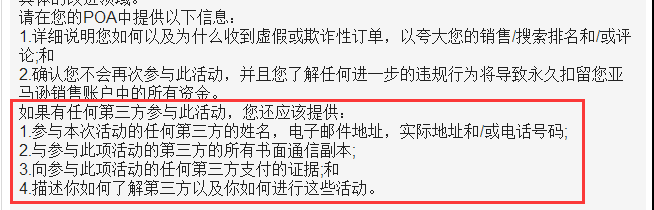据悉,亚马逊在给卖家发送的邮件中,除了要求卖家在POA中交代清楚异常订单以及保证不再刷单之外,还要求卖家提供参与刷单机构的相关信息和所有支付证据。