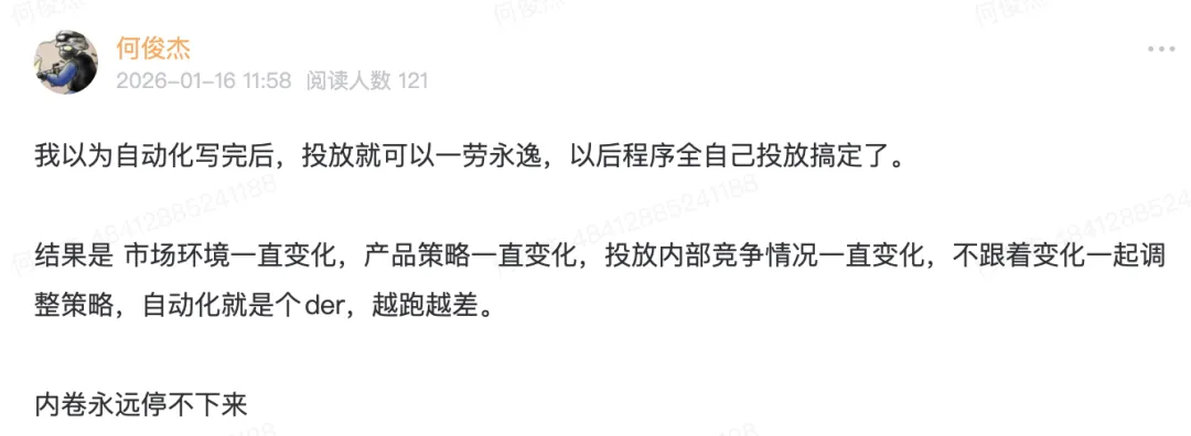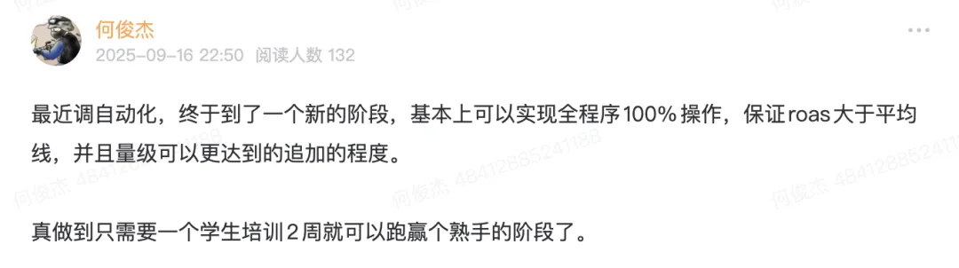 如果大规模投放,全自动并不是最优选择,比如每天100万的预算,全都交给程序投放,和分散到20-30个投手叠加自动化的工具辅助,分散到不同投手去操作,效果可能更好。(鸡蛋不要放在一个篮子里面) 如果是中小产品,预算本身不大,并且竞争压力小的,全自动投放不会有太大问题。确实在短剧领域我也有一个项目,因为关注的少,并且预算不大,没有量级压力,纯卡roas跑最近2个季度几乎没去管,程序跑的非常顺。