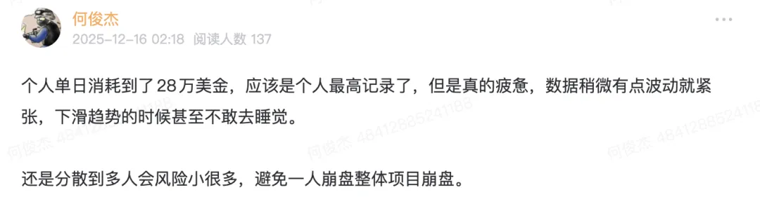 开发成本,实现100%全自动要投入的技术人力,以及要预算喂养去完善系统,成本远大于招聘培养投手。 高预算消耗的精神压力,全程序跑最高应该是到了700万美金一个月的消耗,对roas波动的压力太大,这些压力集中在一个自动化负责人的手里,扛不住,不管这个人是投放负责人,还是自动化的产品负责人最终都结果都是变成”劳累过度“+”心理崩溃“。