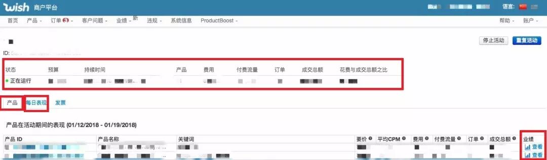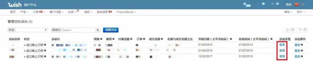 进入“Wish商户平台”(https://merchant.wish.com/),点击顶部导航栏“ProductBoost”>“所有活动列表”,即可看到你已经开展、正在开展或者是新建开展的所有PB活动。点击活动列表右侧的“查看”,你就可以看到此次活动的PB数据表现了。