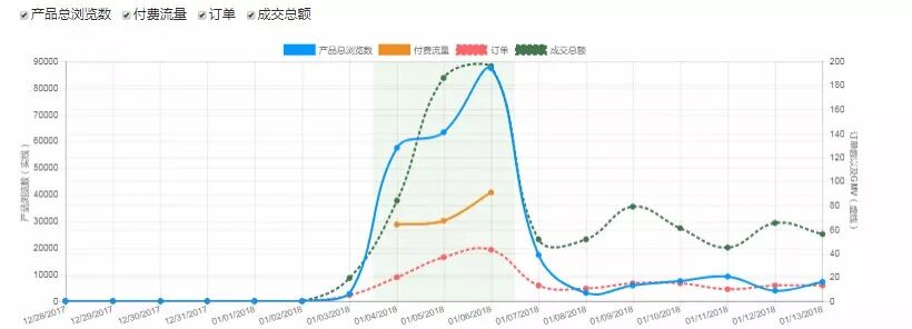 黄色曲线和蓝色曲线之间的部分表示的是此段时间产品的自然流量,通常,在PB活动开展期间自然流量依然比较可观,但黄色曲线代表的付费流量是精准流量,能够实现更高的购买转化,所以,随着PB活动的开展,红色曲线代表的订单数快速上涨。
