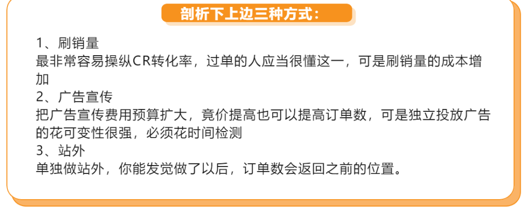 商品在推广一段时间以后(例如半个月),可以做到30单一天,再次提高订单数商,大家可以做的三种最普遍的方式 1. 刷销量。2. 广告宣传 。3. 站外推广。