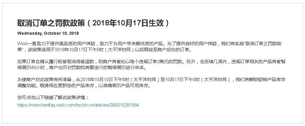 【wish动态】取消订单之罚款政策(2018年10月17日生效)