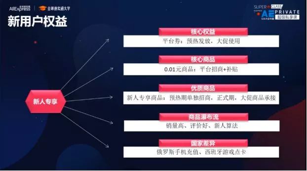 在新人专享板块,首先有一个核心商品区,在预热期时,核心商品区的所有商品都是0.01美元。当新用户购买之后,会获取一个新人劵,这个劵需在正式期才能使用。当这些新用户购买产品时,也有一个个性化的推送策略,即经过对新人行为及老用户行为的数据拆分,实现更精准的推送。