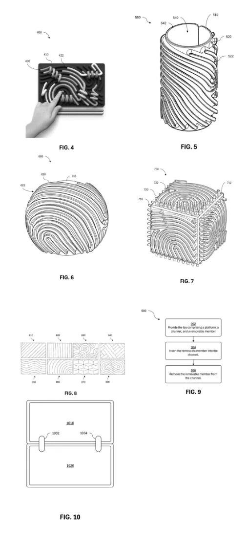 US12478892B2专利于2025年11月25日下证,该专利是一种玩具可包括具有表面的平台,以及由以下部分限定的通道:所述平台的表面;突起,包括从所述平台表面延伸的第一突起段,所述第一突起段具有第一远端边缘段,该第一远端边缘段与所述平台表面间隔一突起距离;以及从所述平台表面延伸的第二突起段,所述第二突起段具有第二远端边缘段,其中所述第二远端边缘段与所述平台表面间隔所述突起距离,且所述平台与所述突起为一体成型结构。该玩具还可包括可拆卸构件,该可拆卸构件的横截面轮廓具有大于所述第一远端边缘段与第二远端边缘段之间间距的外接圆直径,使得所述可拆卸构件被配置为可插入所述通道以形成二者间的卡扣配合。