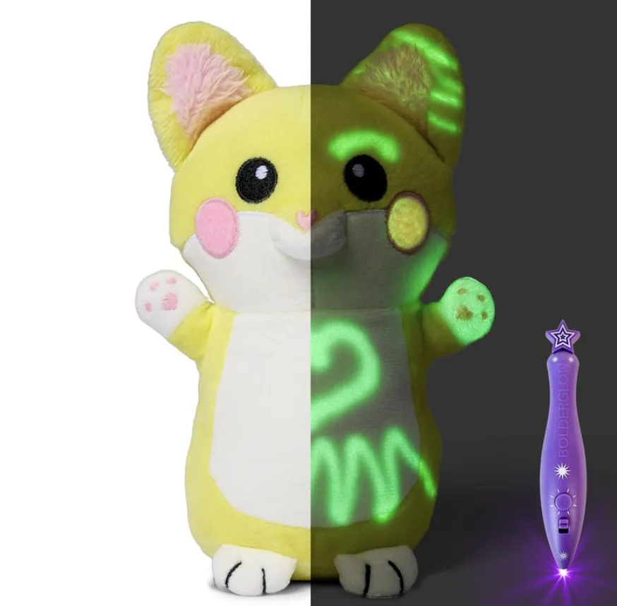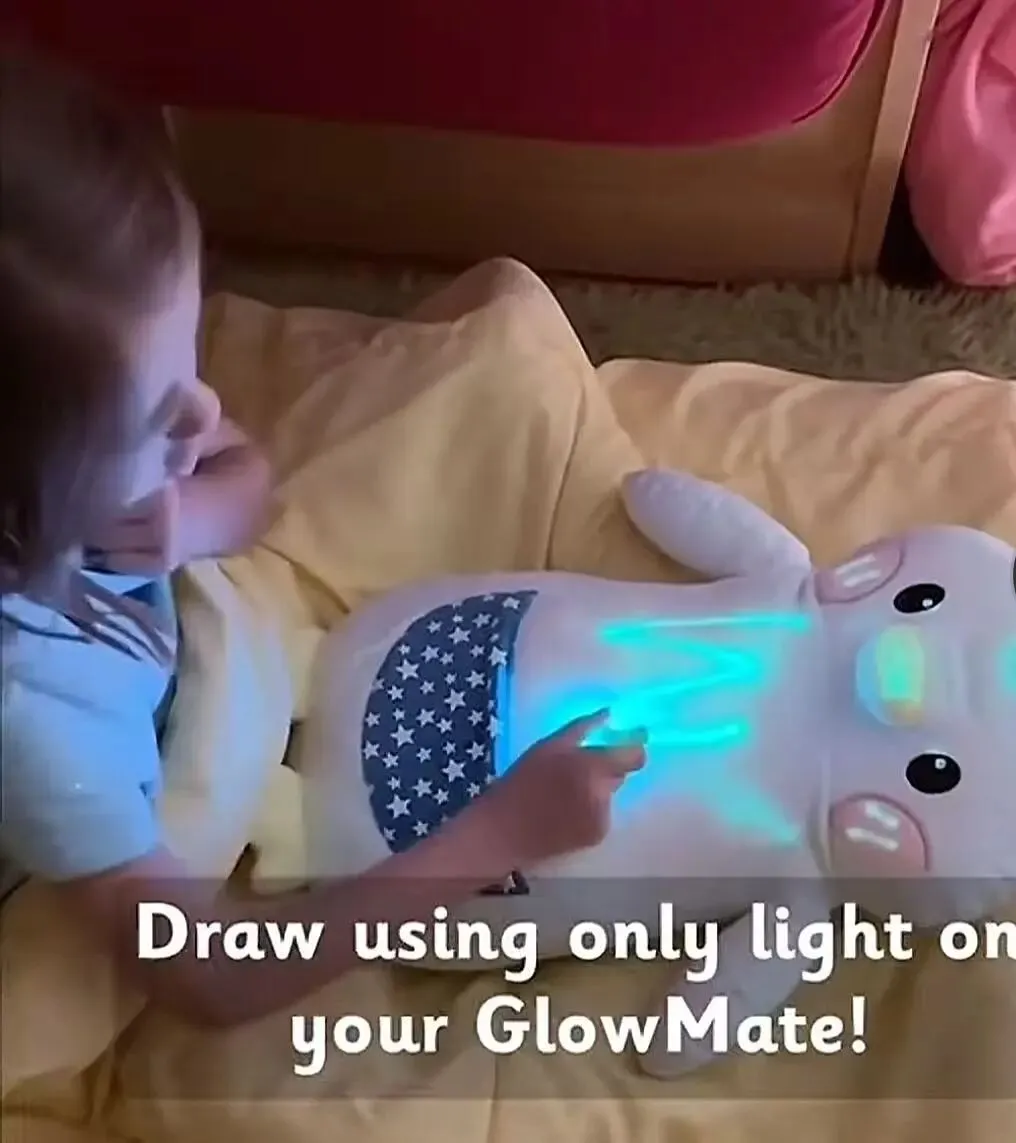 神奇的是,只要在黑暗环境中,用配送的荧光笔绘画,在玩偶上直接就会出现光感的绘画。