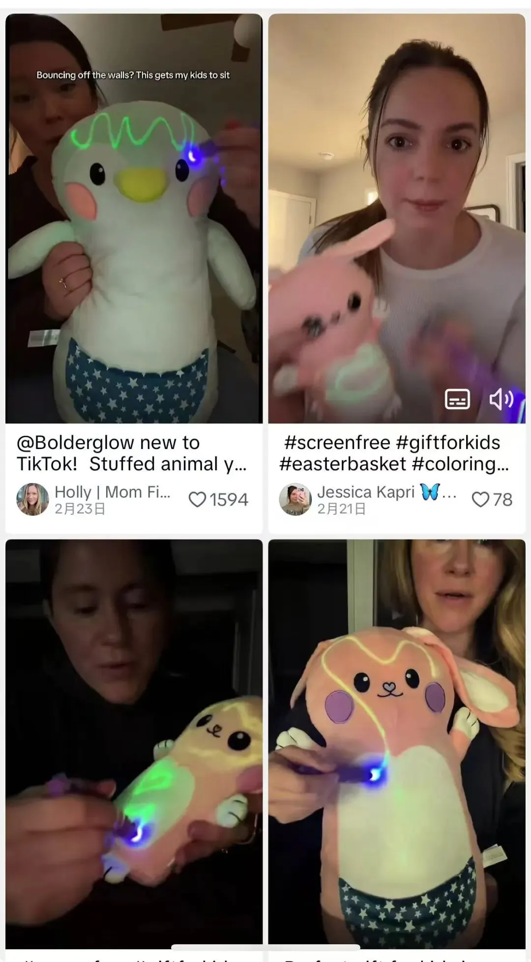 传统的发光玩具多是内置 LED 灯,而这种“光绘”模式赋予了毛绒玩具一种“魔法感”,用户在刷到视频时会产生强烈的心理获得感,这种新奇感是TikTok带货的流量密码!