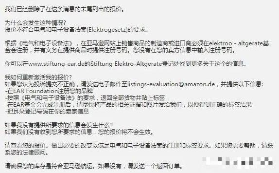 亚马逊不定期会对平台上销售的产品进行合规审查,发现产品不符合合规要求,会要求卖家提供WEEE相关证书或下架产品。据亚马逊告知,接下来会在产品合规方面加大审查,所以对于电子电器产品而言,WEEE注册及申报必不可少。以下为亚马逊卖家收到的关于德国WEEE办理的邮件: