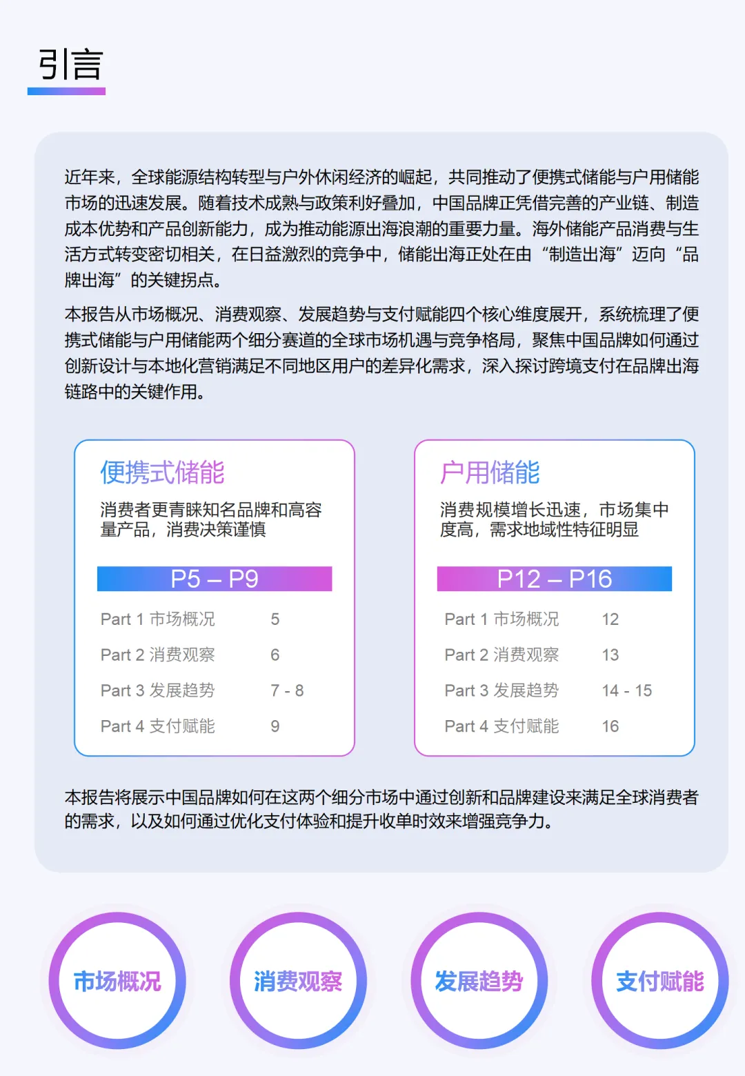报告总结,随着全球能源结构的重塑与海外消费者用能习惯的升级,“绿色经济”正在成为下一个增长引擎。对于中国储能品牌而言,凭借供应链、技术与制造优势,叠加独立站与本地化营销的加持,将在这场全球能源革新中赢得更多话语权。未来,谁能率先实现品牌全球化与支付智能化的融合升级,谁就更有可能在新一轮“能源出海”浪潮中占据先机。