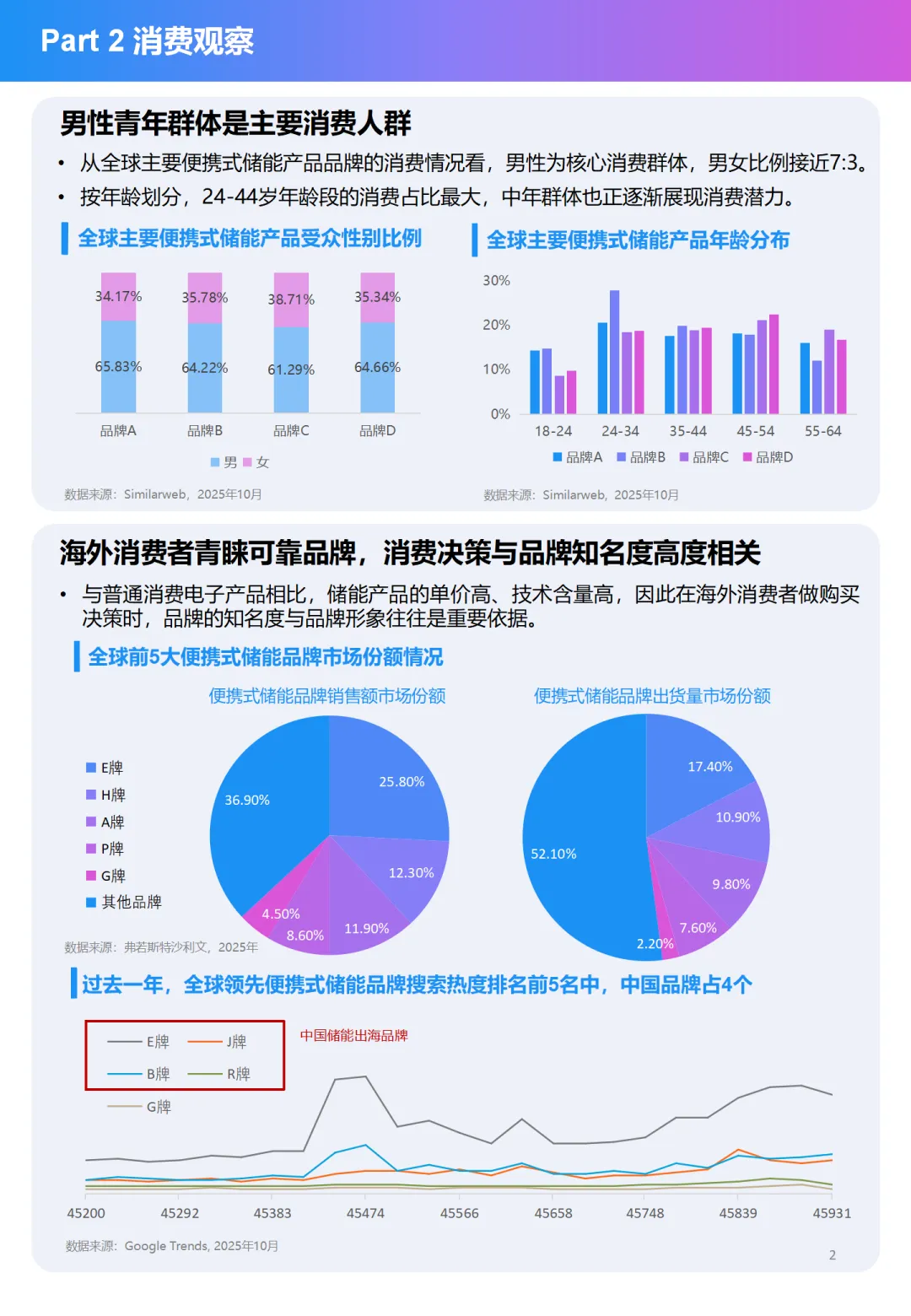在便携式储能领域,根据报告研究,热衷户外探索的海外年轻男性用户成为消费主力,从露营、旅行到车载应急场景,年轻用户构成核心消费群体,品牌信任度成为消费决策关键,中国企业竞争优势显著。产品特性上看,大容量便携式储能产品占比持续上升,锂电池技术进步带动单价平稳下降。品牌通过线上线下营销结合的创新方式强化影响力,追求向“品牌出海”的跃迁。