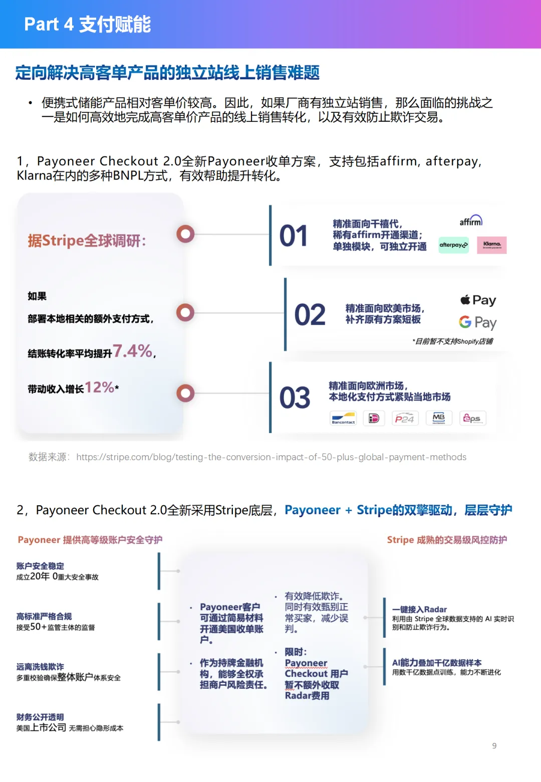 全新升级的 Payoneer Checkout 2.0 收单方案,集成 Affirm、Afterpay、Klarna 等先买后付(BNPL)支付方式,精准提升高客单价产品的独立站结账转化率。该方案基于 Stripe 底层技术构建,配备智能风控体系,能显著控制欺诈交易风险,叠加 Payoneer 派安盈原有的账户安全防护,实现双重安全保障。