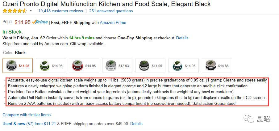 了解到很多电商公司其实对文案的重视不够,大都是停留在一个Translate的阶段,更谈不上Editor了。那其实对卖点的归纳我们依旧有办法实现。当我们拿到一个商品,我们在了解产品本身的属性的时候,我们可以去看一下那些优秀的卖家是如何写卖点归纳的。还是以Kitchen Scale为例: