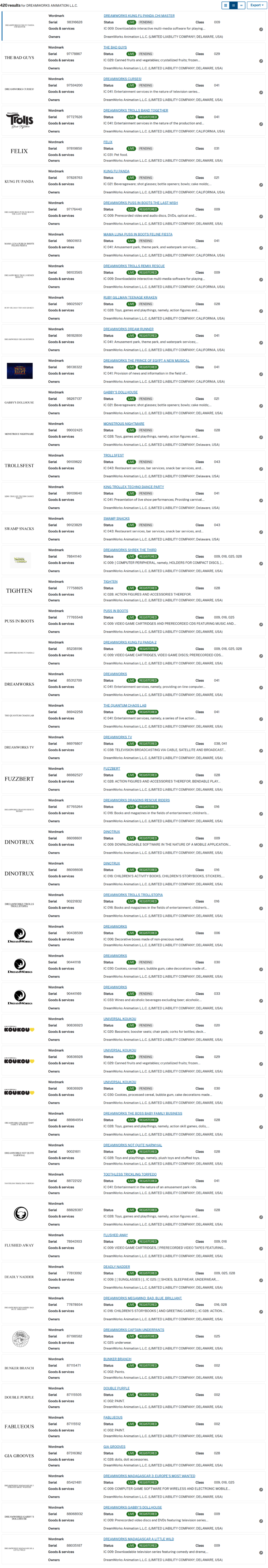 除涉案商标外,原告以DREAMWORKS ANIMATION L.L.C.的名义在USPTO注册了400多个商标,此处不一一列出。其旗下IP均建议未经许可切勿商用。