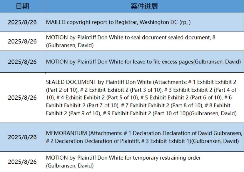 本案起诉时间8月25日,原告已发起TRO申请,最新案件进展如下