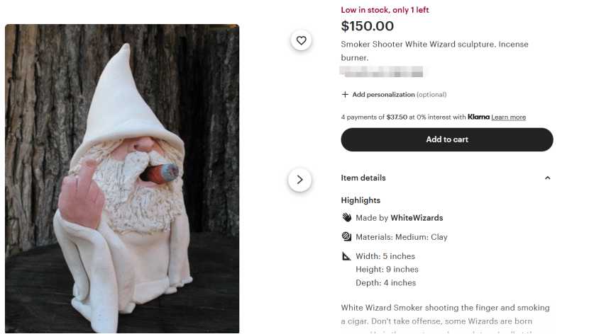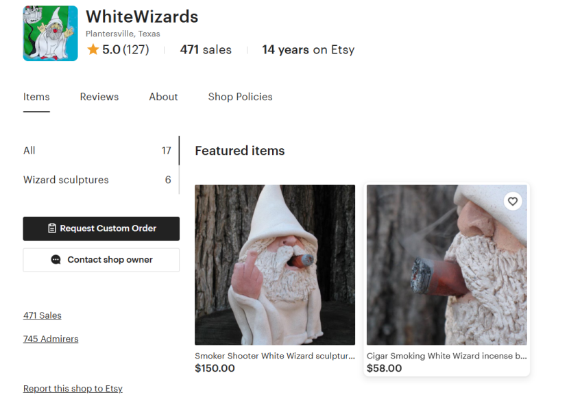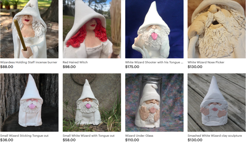 原告Don White在etsy上经营着一家名为White Wizards的店铺,店铺主营的雕塑作品是由 Armadillo 粘土手工制作,适合任何需要魔法的地方。此外,他们还提供定制服务,可以根据客户的需求,比如为吉他手或运动员制作具有特定习惯或举止的巫师形象。只需与他们联系,他们就会为您打造一个独特的巫师。