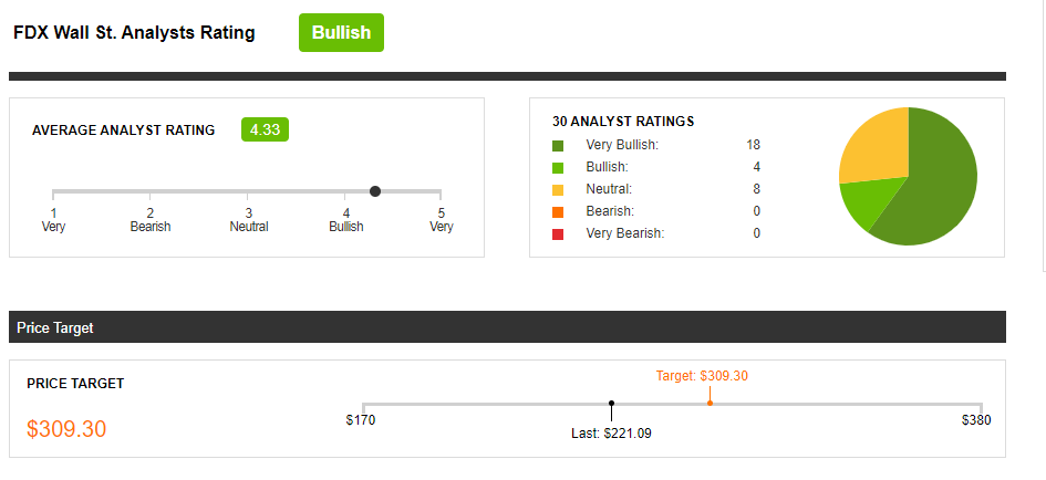 当然也有机构和专业人士看好联邦快递,据Seeking Alpha的数据显示,30位华尔街分析师将联邦快递评为“看涨”,其中18位分析师给予“非常看好”,4位给予“看涨”,8位给予“中性”,共识目标价为309.30美元。