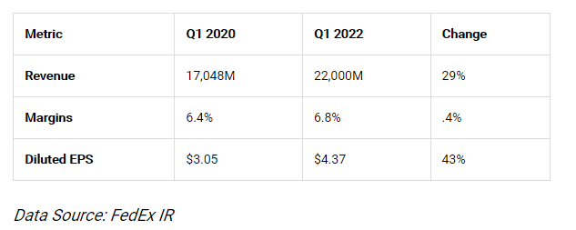 这是因为在上个季度之前,联邦快递已经连续四次超过预期,有时还大幅超过预期。而且,即使在这个艰难的一季度,通过两年的数据对比显示,可以发现每个类别都有令人印象深刻的增长,例如与两年前相比,2022财年Q1调整后摊薄每股收益增长了43%。