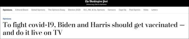 于是《华盛顿邮报》提议,如果美国食品和药物管理局允许某种新冠疫苗上市,拜登和哈里斯就应该立即“全国电视直播”注射这一疫苗,以彰显“抗疫决心”。