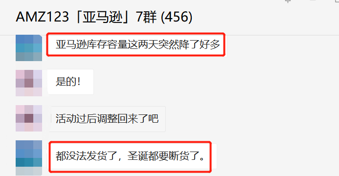 据AMZ123卖家交流群内卖家反馈:亚马逊库存容量这两天突然降了好多,都没法发货了,圣诞节都要断货了。