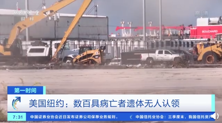 因为美国新冠肺炎疫情严重,出现了新冠肺炎病亡者遗体无人认领的情况。在纽约市距离曼哈顿不远的39街附近,停着不少冷藏车,这些冷藏车中存放着数百具至今无人认领的新冠肺炎死者遗体。